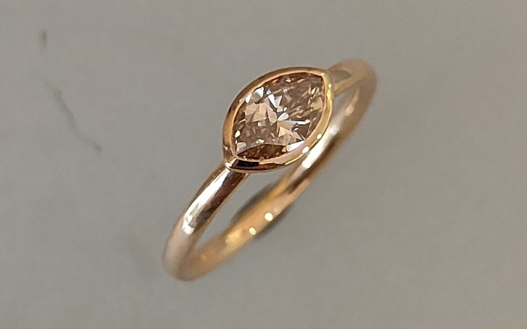 Ring in Rotgold 750 von admin | Sep. 18, 2025 | Uncategorized Unbehandelte zimtfarbene Diamant-Navette Preis: CHF 2500.- MaterialRotgold 750SteinDiamant (Navette)FarbeZimtfarben